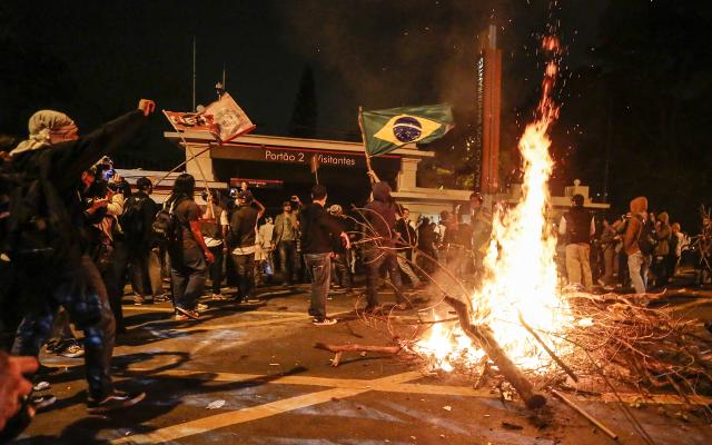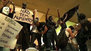 Des centaines de Brésiliens manifestent une nouvelle fois contre le Mondial-2014 à Sao Paulo, l'un des 12 sites de la Coupe du monde de football qui commence dans 43 jours. (...)