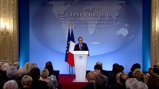 En ouverture de la Conférence des ambassadeurs, François Hollande a refusé toute coopération avec le régime de Bachar al-Assad pour lutter contre le "terrorisme" en Syrie et en Irak, appelant la communauté internationale à préparer une répons (...)